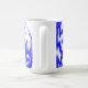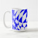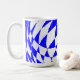 Checkered pattern in blue and white. Optical illusion of a rounded sphere distorts the squares to curve around midpoint of mug.