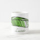 Feather in shades of green, and white. Beneath is name to be personalized, in medium green script.