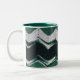 Chevron, or ripple pattern, worked in crochet. Bands of medium and dark green, with variegate greens, and white.