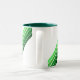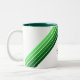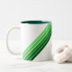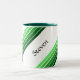 Green lines in varying five shades of blue. Dark to light, bottom to top. Two Sets of stripes are placed diagonally from top to bottom of mug. Personalize with name in center.