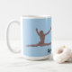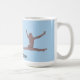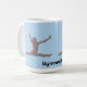 Gymnast leaping through the air. Photograph is altered to look like terra cotta in bas-relief. Image is duplicated on each side of mug. Color is a pinkish purple, or mauve, with a light blue background. "Gymnastics" is centered at the bottom.