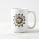 Mandala created from Triangles in two colors at the outer edge of a circle. Inside are ovals. The center is a sun shape with spiraling arms. Central sun is yellow, dark gray-brown ovals in central ring and tan and gray diamonds at outer edge.
