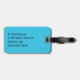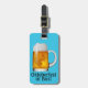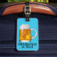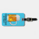 Sky blue luggage tag with a photo of a glass mug of beer, on the front and custom black text, on the front and back. Personalize the text to read what you want.