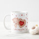 Valentine's Day Cute mug featuring an adorable baby bear holding a sweet heart shaped cookie, little hearts around, all in white, red and beige. Easily personalize the text. - Kate Eden Art