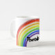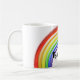 Arch in rings of primary colors, form a rainbow over a name that may be personalized. Colors from inner to out edge: purple, blue, green, yellow, orange, red. Rings have shadow and highlight to make them appear three dimensional.