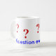 Question marks in red. 5 are spaced around the mug. Below is text in blue "Question everything"