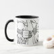 White mug with B&W design.