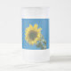 Large yellow sunflower against brilliant blue sky, flanked by smaller opaque panels of single sunflowers.