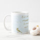 Proverbs 3:5 "Trust in the Lord with all thine heart.." bible quote mug in calligraphy with birds and stars. Blue watercolor background. There is a matching coaster.