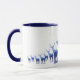 This mug is shown in white exterior with pretty blue deer/elk heard printed on the lower edge of the mug from right to left graduating in size as if they are walking off in the distance. Interior and handle is navy blue.