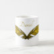 Feather with yellow barbs making up the vane. Two feathers cross at the base of the calamus (shaft). The tips of the feathers rise upwards to the right and left of center. Between the feathers is the name that you edit.