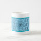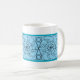 Graphic image of a waterwheel bordered by circles, squares and triangles. Image is repeated three time around mug and is placed on a light blue strip with darker blue border.
