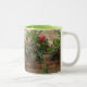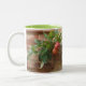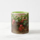 COFFEE MUG FEATURES BLUSHING-PINK APPLES CASCADING DOWNWARD FROM ESPALIER ON BRICK WALL.