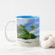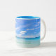 A mug with blue interior and a tropical print of sea, sand/beach, trees and palm tree on the exterior. Text reads: "Relax and enjoy the best of life."
