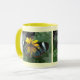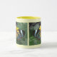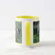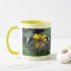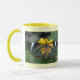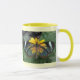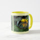 Butterfly with transparent wings, alit on bright yellow flower. Photo on both sides of mug with bright yellow handle.