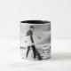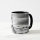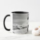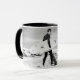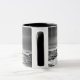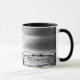 Mug with a black and white image of a surfer heading out for a surf as he walks over the rocks with surfboard in hand.
