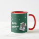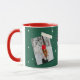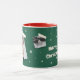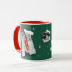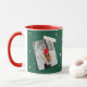 Cute cozy mug with snowflakes and personalized photos of a loved one or dog. Gift mug with snowflakes on a green background for a Christmas or new year gift. Stylize photos glued to the wall with pieces of duct tape.
