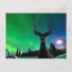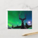 Curious mule deer Odocoileus hemionus staring in camera while photographing spectacular display of green Northern Lights Aurora borealis over moon-lit boreal forest taiga