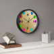 Clock in welve assorted multi-colored gemstones, with gold prong settings and a raised, 3-d effect, on a brushed gold background, framed and accented with black