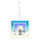 Christmas ornament cube with ocean and beach background and four photo templates to personalize. Made of wood, this unqiue keepsake has blue ocean water background images that frame square photos all around the ornament. Your photos don’t have to be square - they will fill the frames. It’s perfect for pictures of a family beach vacation, honeymoon in a tropical location, kids surfing, pets in the water, or whatever you like. The bottom has a sand image background with space for plenty of text to commemorate the occasion.