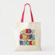 Big bright text in primary colors reads "2nd Grade Rocks" against a background of black sheet music on 2nd Grade Rocks teacher and student T-shirts, hoodies, mugs, school tote bags, cards, stickers, magnets, and more!