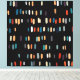 A pattern of irregular rectangles in a color scheme of orange, red, ivory, turquoise, gray, eggplant and black.