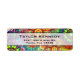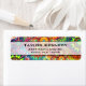A burst of art deco flower shapes and spinning wheels in many vibrant and exciting colors. Many different shapes and patterns with petals and circles and more overlap in this art nouveau ornamental styled pattern. A variety of bright and bold colors gives this pattern excitement and fun which is bursting with life. The dominant colors are vivid lime green, sunburst orange, turquoise blue, tangerine and burgundy red. A banner with a semi-transparent overlay and a black border stretches across the center for easy legible writing of your name and address.