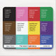 A personalizable mouse pad designed with multicolor combinations of black, pink, red, green, brown, white, yellow, purple, gray, cyan, orange, and blue colors with their respective color meanings.