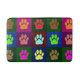 A colorful dog paw print pattern in pink, orange, blue, yellow and other colors.