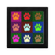 A colorful dog paw print pattern in pink, orange, blue, yellow and other colors.