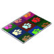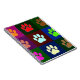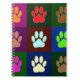 A colorful dog paw print pattern in pink, orange, blue, yellow and other colors.