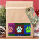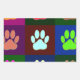 A colorful dog paw print pattern in pink, orange, blue, yellow and other colors.