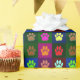 A colorful dog paw print pattern in pink, orange, blue, yellow and other colors.