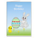 Multicolored Easter bunny, egg Happy Birthday Card. Text can be personalized.