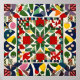 Multicolored quilt with square floral scroll design folk art puzzle, repeating pattern, 19th-century style, red and green color scheme, geometric shapes