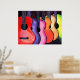 Poster print of multicolored guitars. This picture was designed by Loni and features acoustic guitars in red, purple, pink, orange, tan, yellow, and green on a dark (black) background. The guitars were drawn using colored pencil. Great gift for a musician, guitar player, or music lover! 2010 Loni's Art 570.