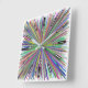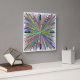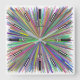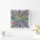 This square clock design features a pattern with lines colored various colors appearing to burst out from a central point. It also features rectangles marking the hours, and numbers indicating the hours "12", "3", "6", and "9".