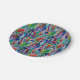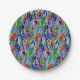 Party paper plates decorated with a mosaic pattern in bright colors.