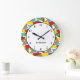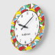 The colorful graphic pattern decorating this easy to personalize wall clock, reminiscent of mid century modern design, has been updated with a lively palette of various hues outlined in black. Customize the background color to suit your style.