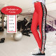 These leggings feature a black bordered red and black multilingual word cloud "Thank You" along the left leg. The right leg features two black stripes.