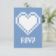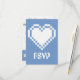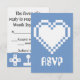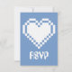 This fun and geeky RSVP card features a periwinkle blue background and a large 8-bit heart in white on the front. A periwinkle border along the bottom edge of the card with a pattern of white video game related icons, including joysticks, D-pads, computer mice, and pixel hearts, decorates the back with some sample text in place above that can be customized to fit your needs.