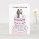 A cartoon bride and groom standing together on top of a large pink and white wedding cake. The word 'Congratulations' accompanies the image.