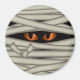 A creepy, wrapped mummy with glowing orange eyes and classic gauze bandages decorates this round fridge magnet. Also available in a green color palette. Search ID685 to see coordinating party supplies and accessories with this great mummy pattern.