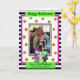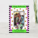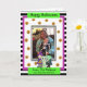 Adorable Family Photo Halloween card full of orange and purple mummy, vampire and witch, candy, spooky cartoon ghost saying, "Boo" and full moon, mummy, witch and Dracula card.