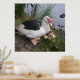 A photograph of a mother Muscovy Duck and her ducklings sitting underneath her.