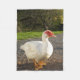 A photograph of a beautiful male Muscovy duck standing in a gravel driveway with a tree in the background.