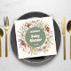 Mushroom Baby Shower paper napkins featuring a whimsical watercolor wreath of red toadstool mushrooms, wildflowers, lavender, and soft greenery with an earthy sage center. Cute tablewear and charming party decorations for a forest mushrooms themed baby shower, perfect for a Whimsical, cute, Earthy Baby celebration. Personalized in honor of the mom-to-be with her name and shower date - ideal for dessert tables, drink stations, brunch spreads, and a cozy woodland/boho rustic baby shower setup.