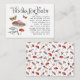 Rustic baby shower book request card featuring watercolor illustration of mushrooms and moths. The card asks guests to bring in a new or used children's book instead of a card.