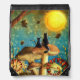 Cute image of two cats sitting atop a giant mushroom in a forest filled with mushrooms watching the autumn leaves fall against the sun and blue sky to create a wonderful storyland picture.