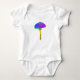 Colorful mushroom photo in front, stripes and mushrooms back. Funny baby bodysuit design.
